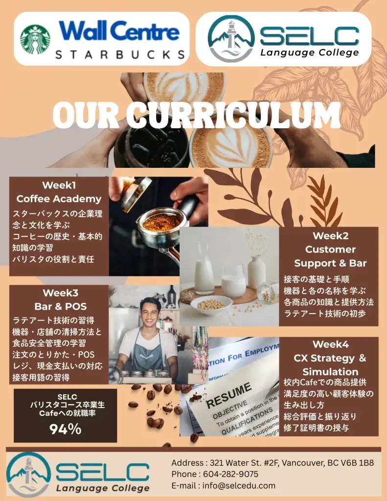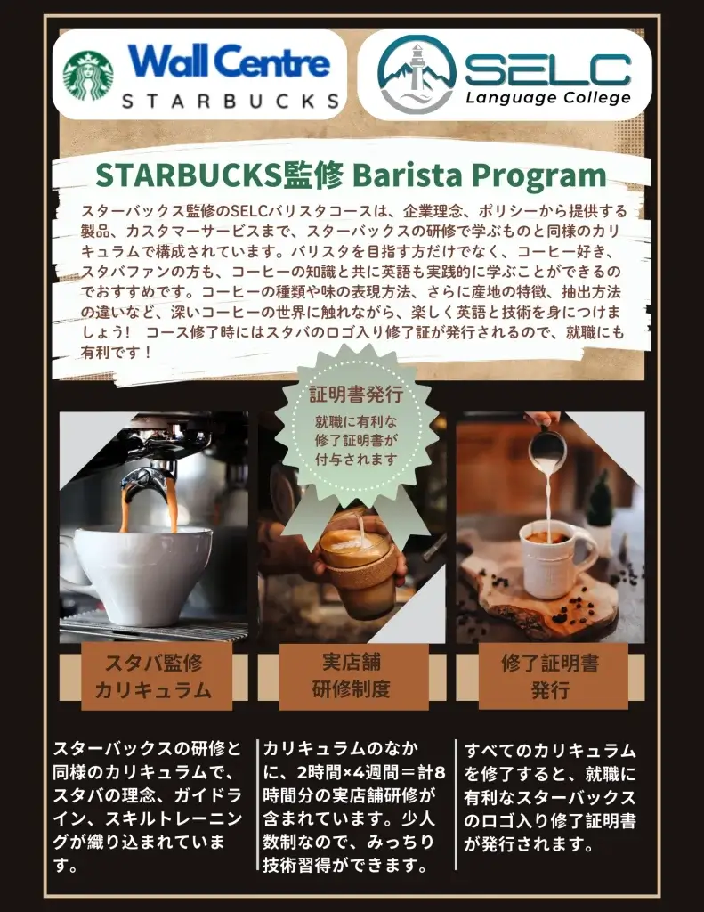 当コースはスターバックス監修のもと、企業理念、ポリシーから提供する製品、カスタマーサービスまで、スターバックスの研修で学ぶものと同様のカリキュラムで構成されています。コーヒーの知識と同時に英語も実践的に学ぶことができます。コース修了時にはスタバのロゴ入り修了証が発行されます。