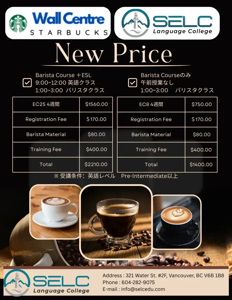 SELCは、バンクーバーの発祥の地であり、ガスタウンに位置しています。周りには、レンガや石畳の道路、また文化財に指定されている世界で唯一の「蒸気時計」などがあり、レトロな開拓時代の雰囲気が楽しめるお洒落なエリアです。校内では、自然と英語口・英語耳を養う為に、厳しい英語オンリーが徹底されています。発音矯正にも力を入れており、日本人が苦手な英語音を徹底指導するなど、ユニークかつ効果的な発音矯正プログラムで、ネイティブ・スピーカー並みの発音を目指します。ワーキングホリデーでの滞在者に人気のコースは、カフェ英語+バリスタのスキルを学べるプログラムです。接客英語に加え、エスプレッソマシーンの操作なども学びます。英語だけでなく、留学で最大の効果を上げるための ノウハウや、自己主張の仕方など、世界で活躍する人材を育てる為に、日本人に向けたグローバルスキルをも教えているユニークな学校です。また、併設の専門学校ではビジネスやホスピタリティなどより専門的な分野を学ぶことができ、インターンシップの手配が可能なコースもあります。