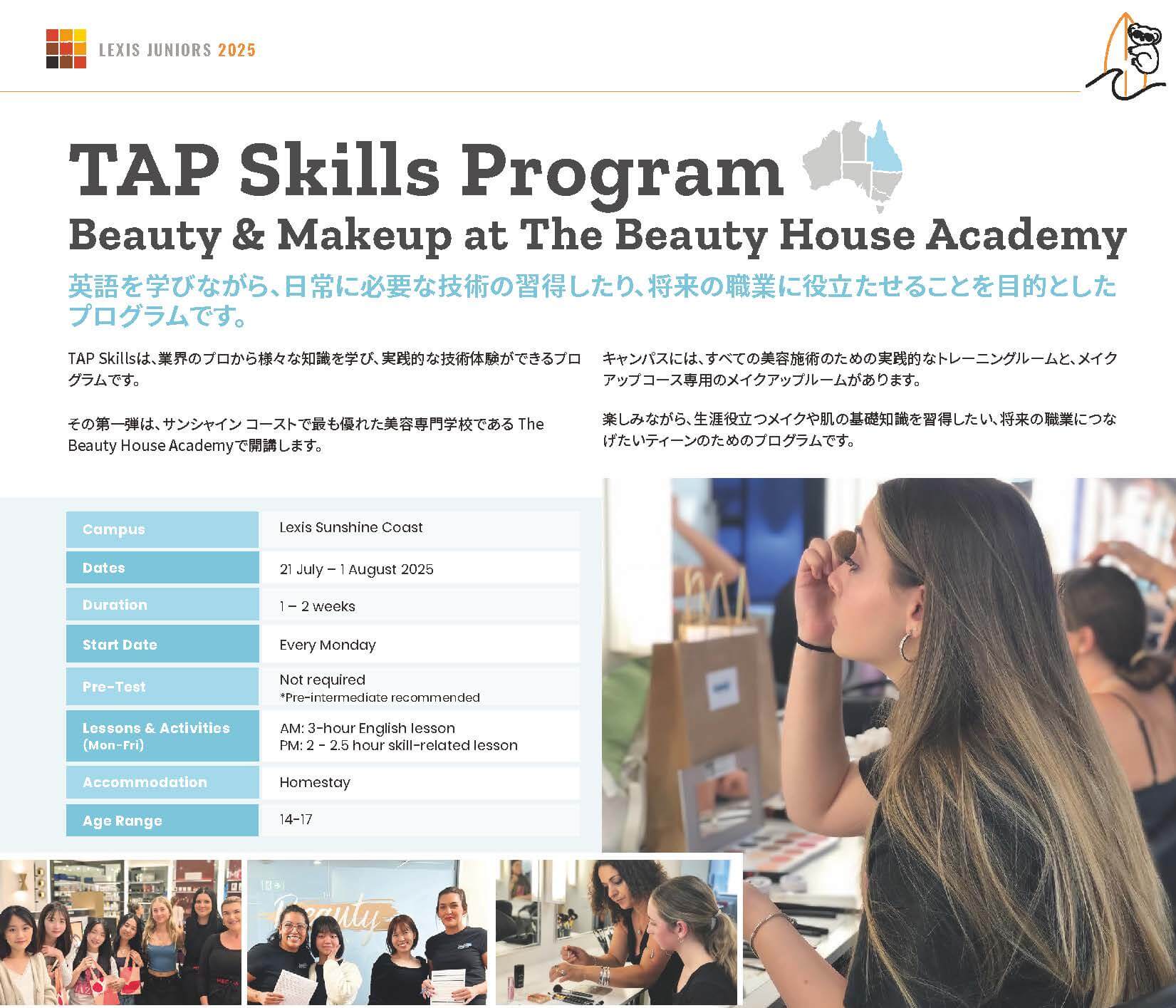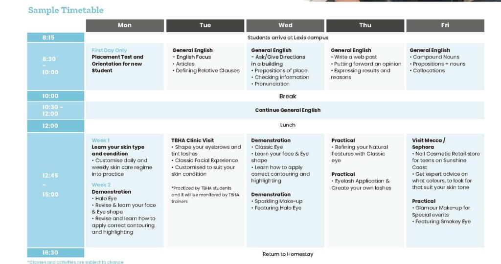 午前中は、語学学校にて3時間の英語研修、午後からは、サンシャイン コーストで最も優れた美容専門学校である The Beauty House Academyにて2~2.5時間のメイクアップレッスンを受講します。キャンパスには、すべての美容施術のための実践的なトレーニングルームと、メイクアップコース専用のメイクアップルームがあります。楽しみながら、生涯役立つメイクや肌の基礎知識を習得したい、将来の職業につなげたいティーンのためのプログラムです。