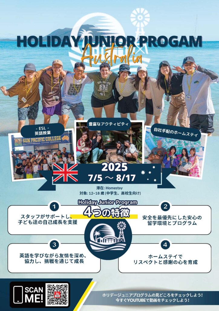 去年は、1,200名の留学生が参加した大人気の留学&ホームステイプログラムが、春休みも開講します。対象は12 歳~18 歳(中学1年生~高校3年生)ケアンズの老舗の語学学校にて語学研修と、ケアンズならではのさまざまなアクティビティ体験がセットになっています。本プログラムの英語学習の主軸は、ホストファミリーとの交流となります。宿題の内容は、ホストファミリーに何かを質問するといった家族間の交流を多く持つようにカリキュラムを組んでいます。また、ケアンズ在住歴の長い日本人スタッフが現地でサポートしますので、初めての海外留学の方にも安心です。
