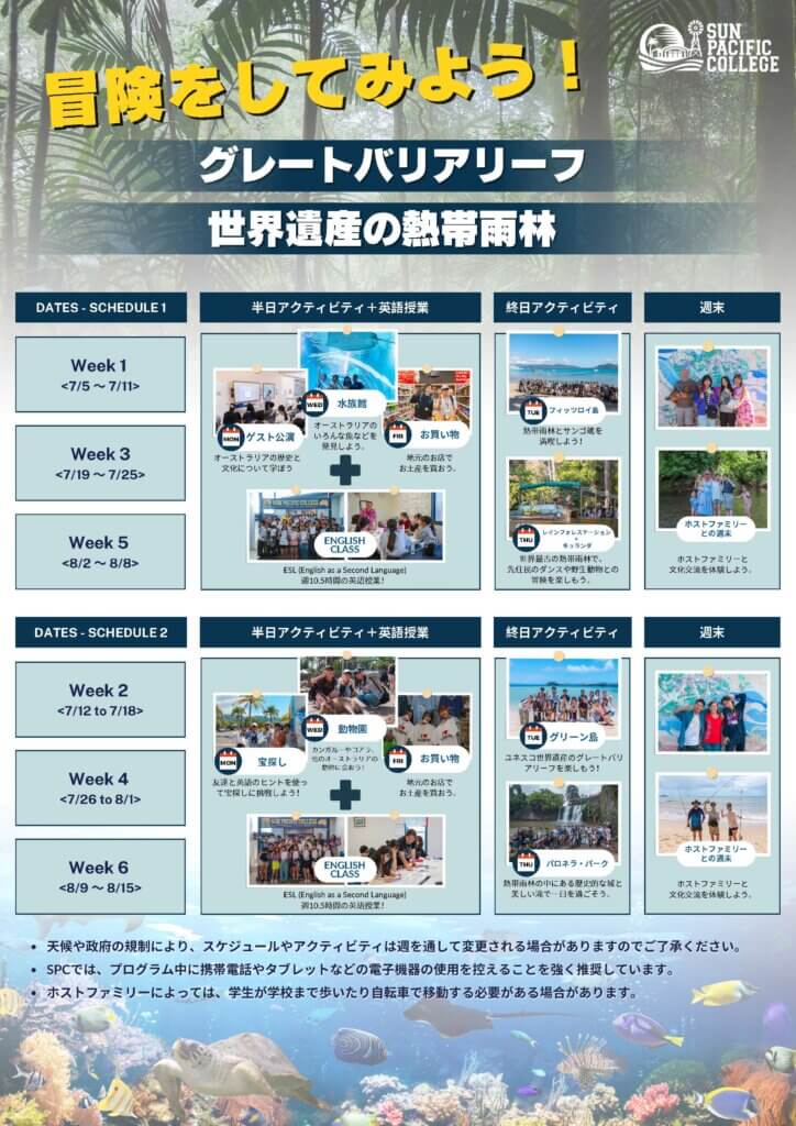 毎日(平日)オーストラリア・ケアンズならではのアクティビティが企画されています。世界遺産の熱帯雨林 キュランダや、ユネスコ世界遺産のグリーン島(グレードバリアリーフ)などのアクティビティが、毎週含まれています。2週間滞在であれば、どちらも観光でき、オーストラリアの大自然も十分に満喫していただける内容になっています。