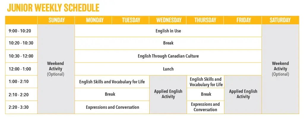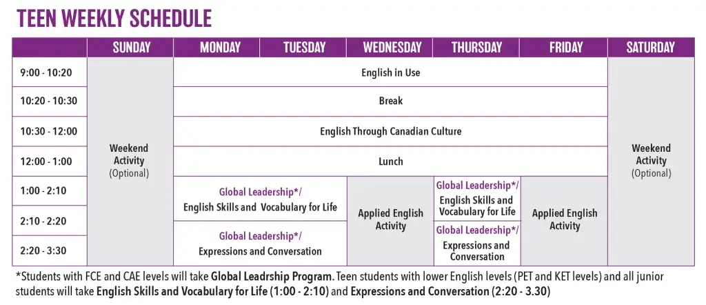 ※ (月)、(火)、(木)の午後は、Teen CampのFCE および CAE レベルの学生は「グローバル リーダーシップ」を受講します。Summer CampのPET および KET レベルの学生と、全てのJunior Campの学生は、英語のスキルと語彙 (1:00 – 2:10) と表現と会話 (2:20 – 3.30) を受講します