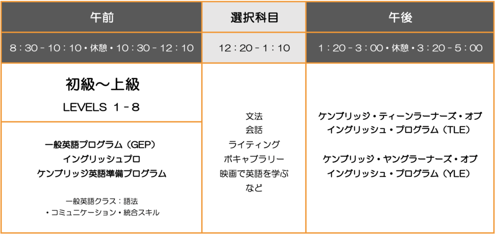 グローバルビレッジは、ハワイとカナダ2都市にセンターを持つ語学学校で授業の質、講師のキャリア、設備など、生徒を飽きさせないアクティビティ、自社手配のホームステイなど、全てに深いこだわりを持ち、全てにおいて質の高いサービスを提供できるように心がけています。授業は、総合的な英語力アップを目標としたカリキュラムが組まれ、特にコミュニケーション能力に焦点を当てた内容で行われます。校内は母国語禁止が厳しく徹底され、勉学に集中できる環境が整えられています。 午後の授業は選択制で、会話レッスンから試験対策コースまで、目的に合わせて学習することができます。また、校内の国籍に偏りが出ないよう、各国籍の生徒の割合を各国30%以内に制限しているのも、GVならではの特徴のひとつです。